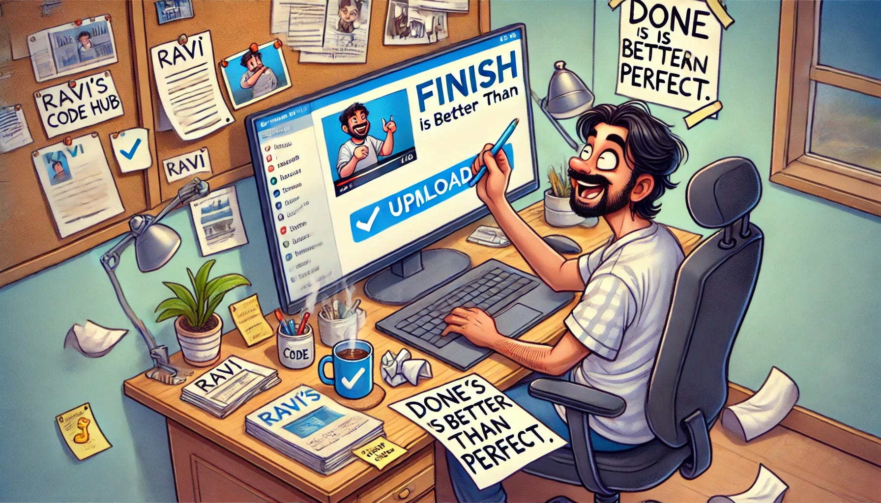 Remember Ravi from earlier? After five more project ideas, he finally realized that maybe, just maybe, starting wasn’t enough. So he went back to his first love—“Ravi’s Code Hub”—and decided to just hit record on his first video, mistakes and all. Was it perfect? Nope. Did he stumble over his words? Absolutely. But did he finally upload it? Hell yes.