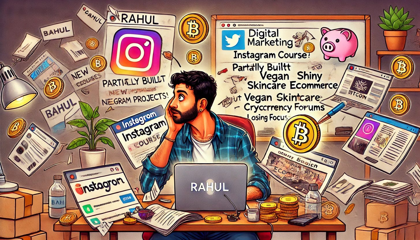 Here’s Rahul, a digital marketing freelancer from Bengaluru who, if you ask him, is always “hustling.” Rahul is the king of multitasking—or so he likes to think. One day, he’s all in on creating an Instagram course for beginners. The next, he’s obsessed with building an eCommerce store for vegan skincare products. And then, out of nowhere, he decides the real money is in crypto, so he spends a weekend deep-diving into Bitcoin forums, convinced he’ll be a millionaire by Monday.
