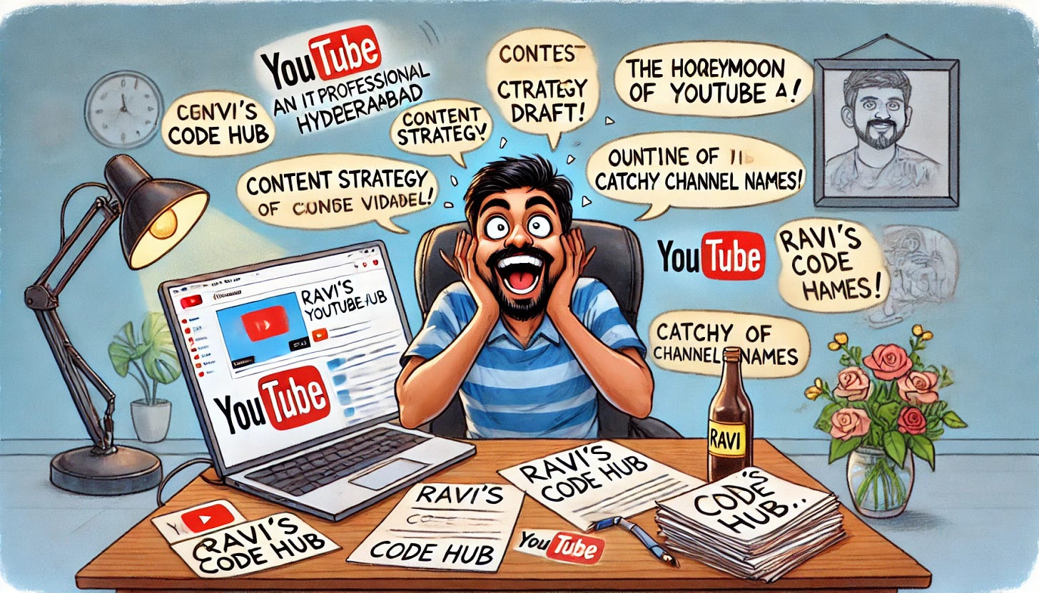 He gets home, skips his evening Netflix binge, and dives right into planning. He drafts a content strategy, outlines his first ten videos, and even picks out a catchy channel name—“Ravi’s Code Hub.” The excitement is real, and Ravi’s on fire. He tells his wife, his friends, and even that one uncle who still thinks “YouTube” is a type of toothpaste. Everyone is impressed. Ravi feels like a rockstar.